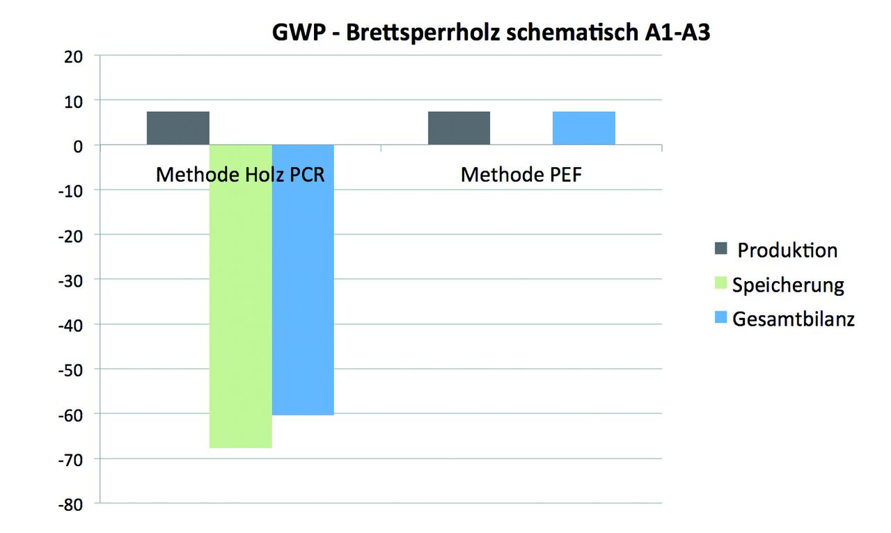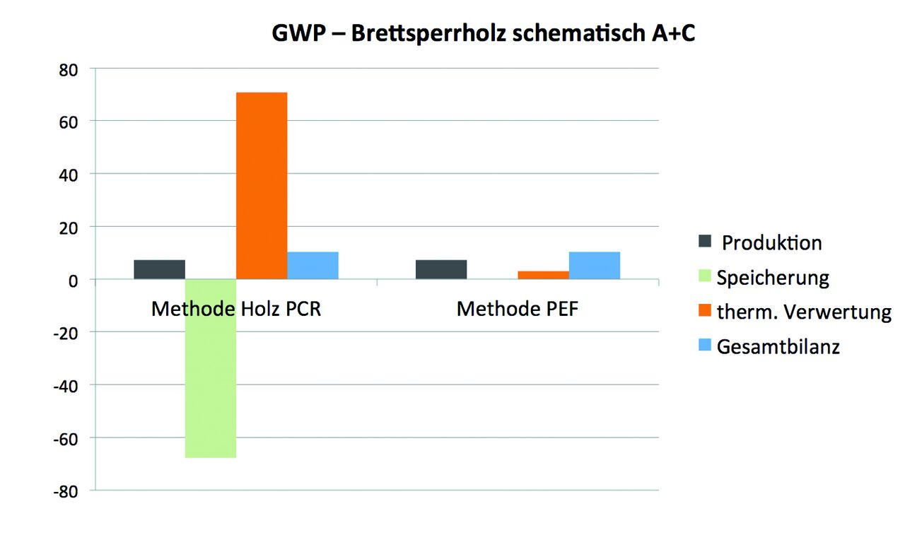 Bisher erhielt, gemäß Holz-PCR (EN 16485) und nicht im Widerspruch zur aktuellen EN 15804, aus der Natur in die sogenannte Technosphäre (zur Holzverarbeitung) eingebrachtes Material ein negatives Treibhauspotential (der im Holz enthaltene Kohlenstoff wurde beim Wachstum ja der Atmosphäre entzogen und zwischengespeichert). Am Ende des Lebenszyklus von Holzprodukten, wenn das Holz aufgrund des Energieinhaltes verbrannt wird, war das GWP wieder positiv auszuweisen, was zu einer ausgeglichen CO2-Bilanz, aber eben zu (Produkt-) lebenslanger Sequestrierung aus der Atmosphäre führte. Damit konnte die temporäre CO2 Speicherung klar und übersichtlich dargestellt werden.