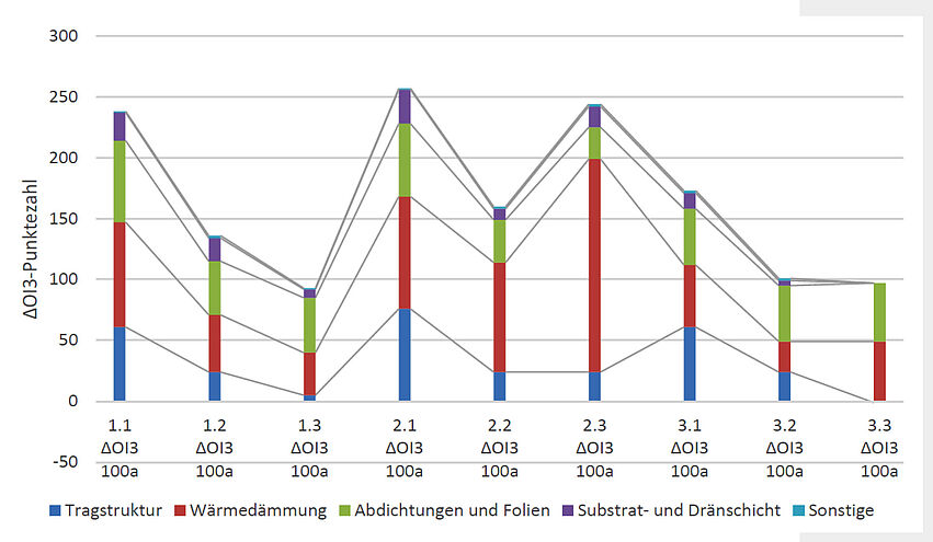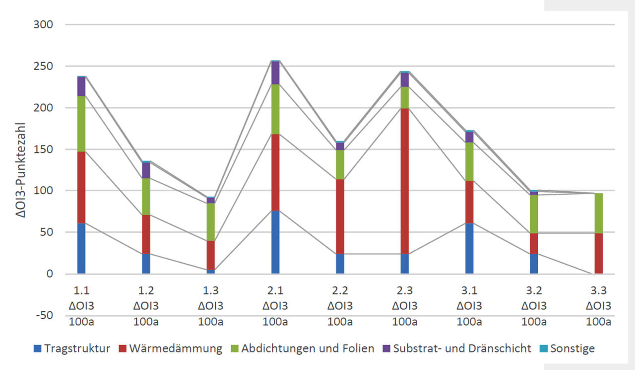 Unter den ausgewählten Aufbauten und Materialien konnten vor allem die Tragstruktur, die Wärmedämmung und die Abdichtung als maßgebender Stellhebel identifiziert werden. So schnitten in der Regel Bauteile mit leichterer Tragstruktur wesentlich besser ab als schwere. Bei Betrachtung der Wärmedämmungen schneiden jene auf Basis nachwachsender Rohstoffe erwartungsgemäß am besten ab.
