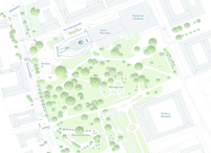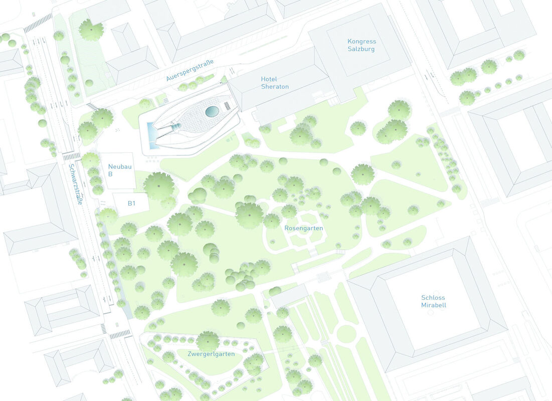 Der moderne Neubau bietet direkt am Mirabellgarten gelegen einen Ausblick auf die Salzburger Innenstadt und in den Kurpark. Städtebaulich bildet der Bau ein Gelenk zwischen den gründerzeitlichen Blockstrukturen der Auerspergstraße, der offenen Bebauung der Schwarzstraße und dem historisch gewachsenen Mirabellgarten. Die zum Park verschwenkte Geometrie des Badehauses nimmt Bezug auf die verschwundenen barocken Bastionsmauern und den zugeschütteten Wassergraben. Als Widerhall der ehemaligen Stadtbefestigung und der bis heute erhaltenen Wasserbastei ist das Badehaus als begehbare Erweiterung des Kurgartens konzipiert.