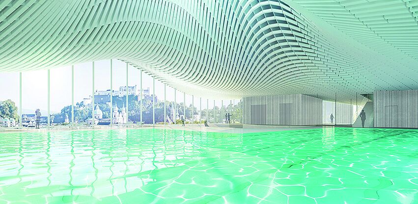 Nach oben durch die sanften, wellenartigen Formen der Dachkonstruktion begrenzt, öffnet sich die Bade-Ebene umlaufend über ein durchgehendes Band aus großformatigen, geschoßhohen Glaselementen zum beeindruckenden Panorama auf die historische Altstadt. Die unterschiedlichen Raumhöhen unterstreichen die Vielfalt der räumlichen und atmosphärischen Situationen. Zugleich wird über die Reflexionen des Lichtes in der Wellenuntersicht das Bild des Bades sicht- und erlebbar transportiert.