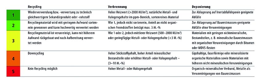 Für die ökologische Bewertung werden die Ökobilanzindikatoren Primärenergieinhalt an nicht erneuerbaren Ressourcen (PENRT), Globales Erwärmungspotential (GWP), Versauerungspotential (AP) und der daraus aggregierte OI3 herangezogen. Bewertet werden Herstellungsphase und Austausch von Baumaterialien nach Ablauf ihrer Nutzungsdauer über einen Betrachtungszeitraum von 100 Jahren. Die Entsorgungswege und -prozesse werden auf Basis der heutigen Entsorgungspraxis mit Hilfe einer Matrix (Tab. 1) eingestuft, auf Bauteilebene zusammengeführt und daraus eine Einzahlbewertung abgeleitet.