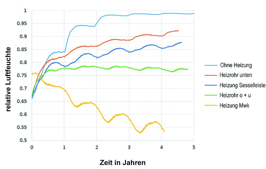 Bei einer Temperierung im Bereich des Mauerwerks (Abb. 5, dritte von oben) kann die Tauwasserbildung hingegen gezielt reduziert werden. Ebenso kann die relative Luftfeuchte bei Temperierung mit zwei Heizrohren (Abb. 5, unten) auf einem unkritischen Niveau gehalten werden.