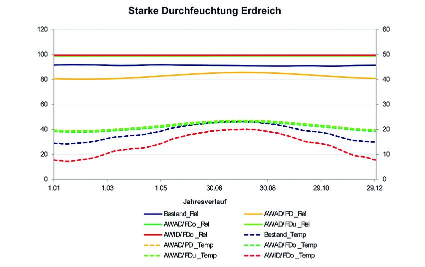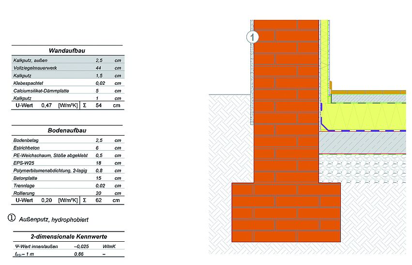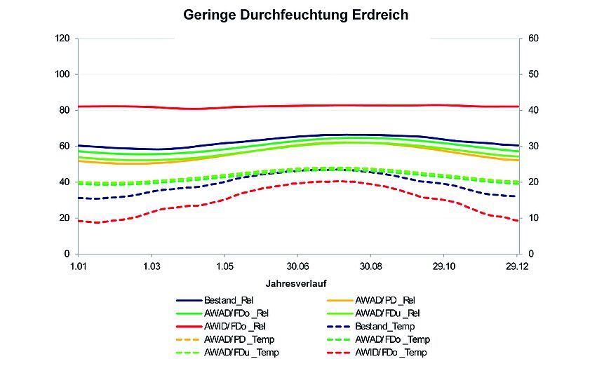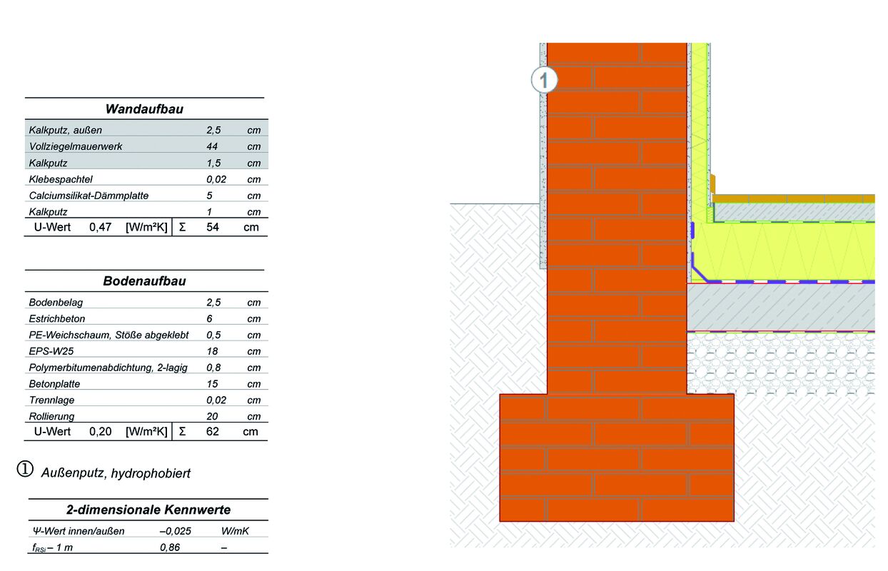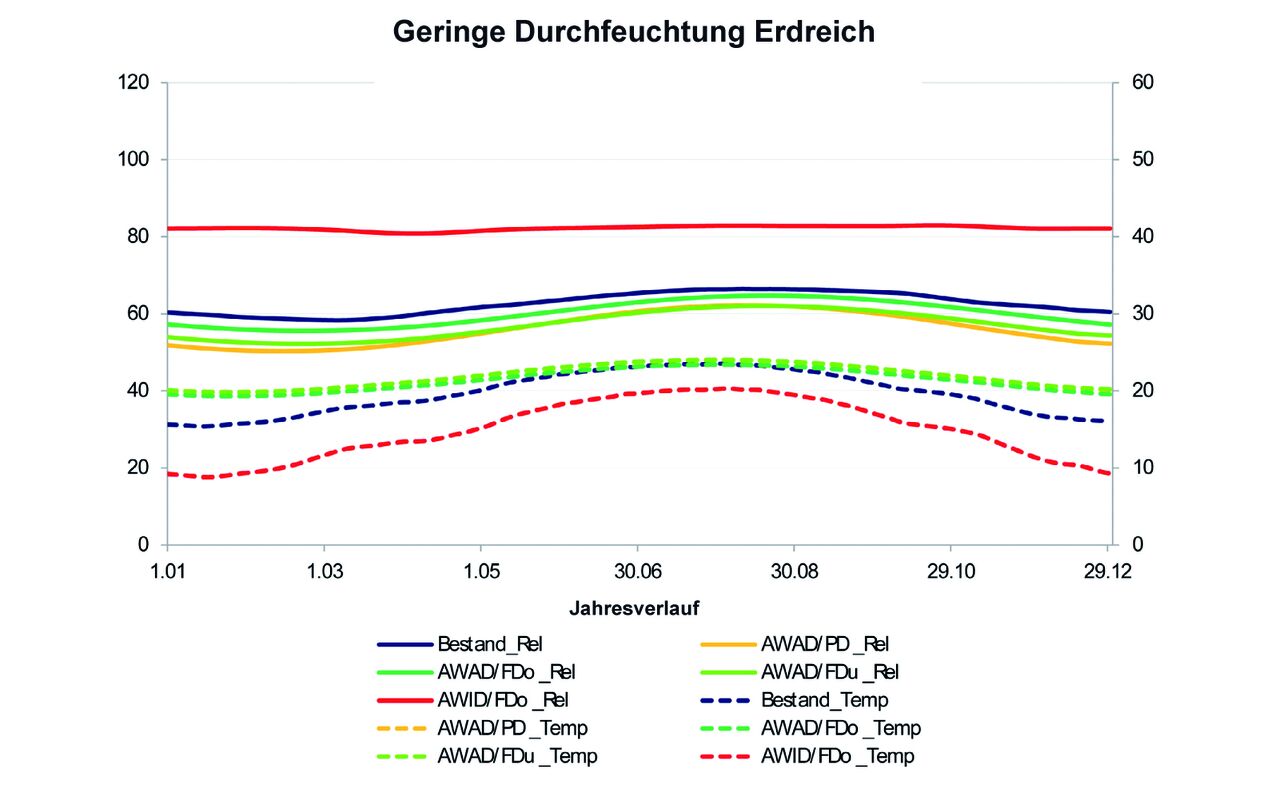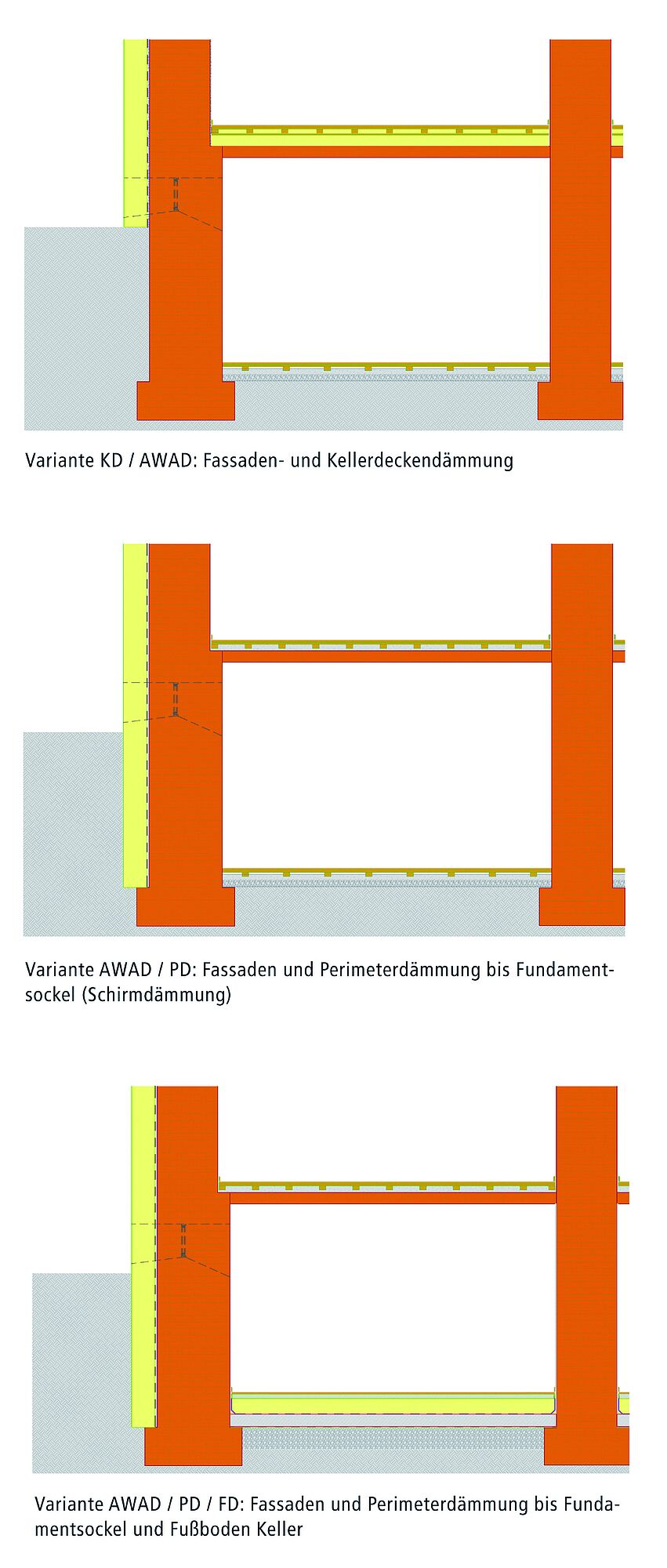 Maßnahmen zur Verbesserung des Wärmeschutzes auf Passivhausniveau im Erdgeschoß und Sockelbereich (Abb. 2.) beeinflussen wesentlich das Feuchteverhalten im Keller (Abb. 3 und Abb. 4). Typische Sanierungsvarianten wurden anhand von Simulationsreihen untersucht. Die Ergebnisse wurden in Form von Planungsempfehlungen im Buch aufbereitet. Lösungen mit Außendämmung und Bodenplattendämmung – sind beispielsweise ohne weitere Maßnahmen zur Reduktion des Feuchteeintrags – nur bei geringer Durchfeuchtung des Erdreichs geeignet.