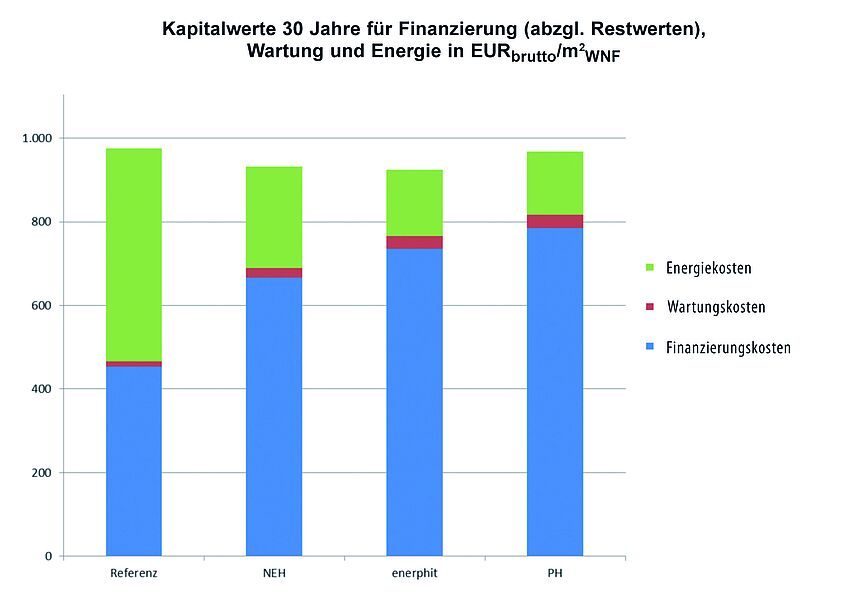 Detaillierte Studien zu Kosten und Wirtschaftlichkeit hocheffizienter Gebäudesanierungen sind noch selten. Einige realisierte Gebäude zeigen, dass auch hier hohe Einsparungen realisierbar sind. Im Buch werden die Wirtschaftlichkeit der Sanierung mehrgeschoßiger Wohngebäude auf Standard des Niedrigenergiehauses, Standard EnerPhit und Standard Passivhausniveau und eine Sanierung entsprechend der gesetzlichen Mindestanforderungen gegenübergestellt (Abb. 1) und die wesentlichen Aspekte herausgearbeitet.
