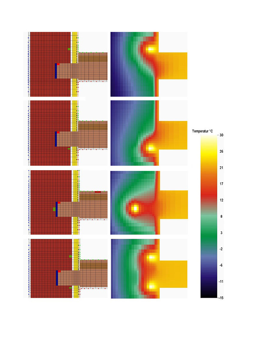 Die Varianten für die Lage der Wärmequelle (links) sowie das Temperaturfeld der Konstruktion zeigt Abb. 5, wobei jener Zeitpunkt dargestellt wird, an dem der Holzbalkenkopf bei der Variante ohne Temperierung die geringste Temperatur aufwies.