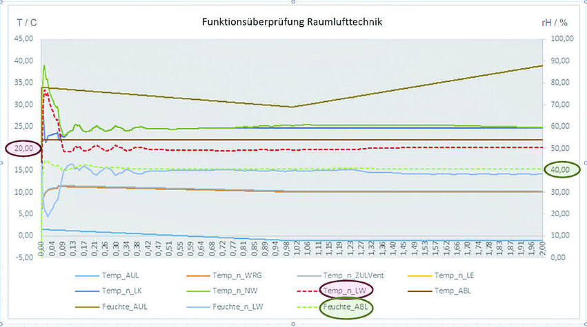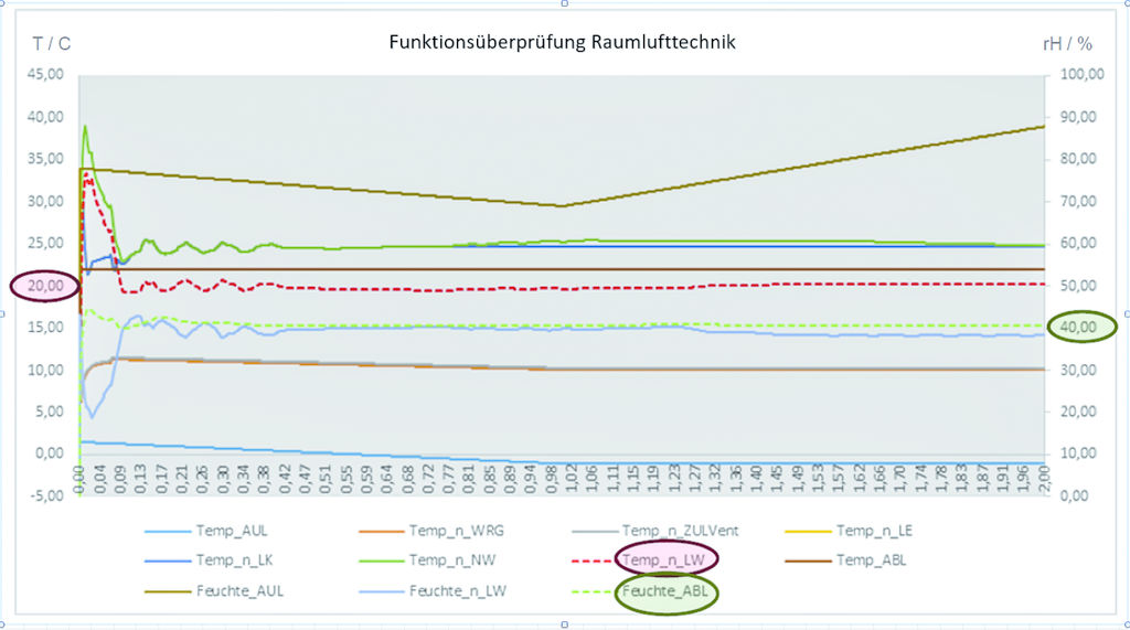 Die Abbildung 4 zeigt beispielhaft eine Auswertung, die im Rahmen der HIL Überprüfung entstand. Dabei wurde die korrekte Funktion eines Lüftungsreglers im Winterfall untersucht. Ziel ist es, dass die Zielgrößen 40 % relative Feuchte der Abluft und 20 °C in der Zuluft erreicht werden. Fehler durch falsche Ventilstellungen würden somit noch vor realer Inbetriebnahme erkannt werden. Im Zuge der qualitätssichernden Maßnahmen im PEAR Projekt konnte ein kleiner Programmierfehler z.B. das nicht Öffnen des Nachheizregisterventils im Sommerfall, gleichzeitiges Heizen und Kühlen bei der Betonkernaktivierung, erkannt und behoben werden. Dieser Fehler hätte sich in Form von zu geringen Zuluft-Temperaturen und dem damit einhergehenden Komfort- und Effizienzverlust geäußert. Dies wäre erst nach Übergabe des Objektes schlagend geworden. Die Fehlerbehebung hätte dann einen höheren Aufwand (zeitlich und finanziell) verursacht.