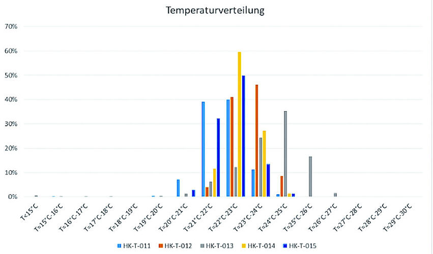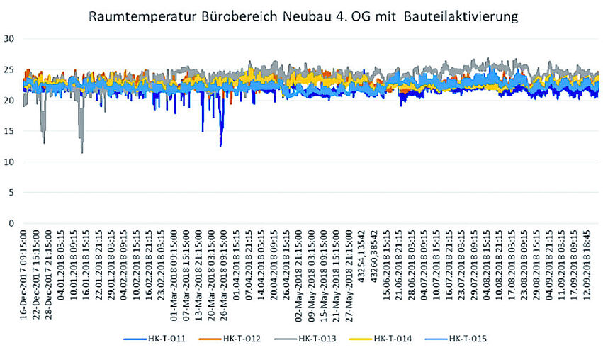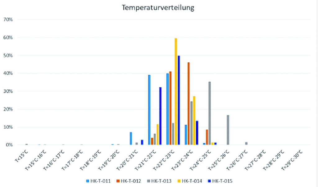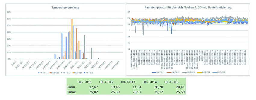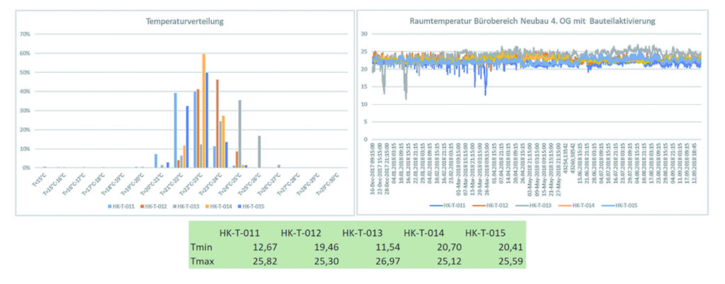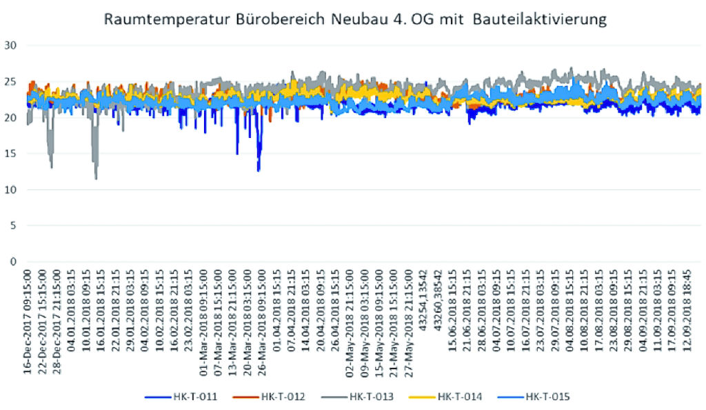 Mithilfe der Monitoring-Daten konnten die Raumtemperaturen der Büroräume mit aktivierter Betondecke in diversen Teilbereichen analysiert werden. Die Abbildungen 5a–c zeigen die Ergebnisse der Auswertung fünf exemplarischer Regelungszonen (HK-T-011 bis 015) von Büroräumen des 4. Obergeschosses Neubau. Links, die Häufigkeitsverteilung der Raumtemperatur dargestellt, rechts, der dynamische Verlauf der Raumtemperatur von Mitte Dezember 2017 bis Anfang September 2018. Bis auf einige Ausreißer bzw. Zeiträume, liegen die Werte im normkonformen (EN ISO 7730, Kategorie B, Raumtemperatur, Sommerfall: 24,5 °C ± 1,5 °C, Winterfall: 22,0 °C ± 2 °C) behaglichen Bereich.