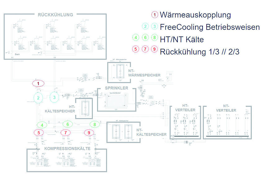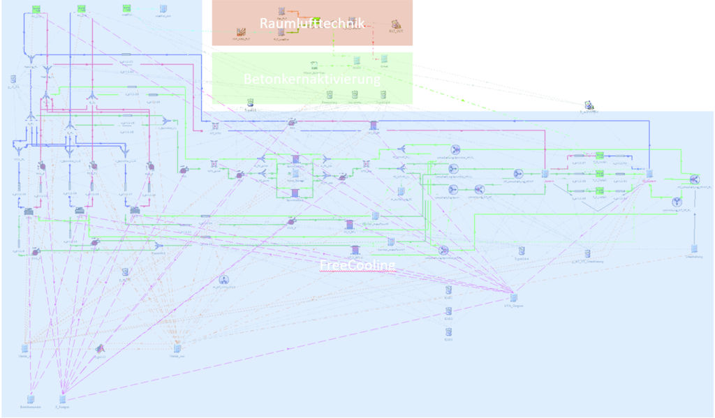 Die Entwicklung dieser intelligenten Regelstrategien in der Inbetriebnahme war Gegenstand des Projekts, wobei besonderes Augenmerk auf die Raumlufttechnik, FreeCooling und Betonkernaktivierung gelegt wurde.