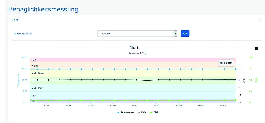Vor allem in mechanisch gekühlten Objekten bieten sich Behaglichkeitsmessungen nach ÖNORM EN ISO 7730 an. Damit können nicht nur Lufttemperatur und Luftfeuchtigkeit, sondern auch die Strahlungstemperatur und Zugluft bewertet werden (Abb. 8).