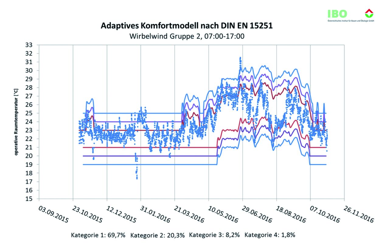 Wenn keine mechanische Kühlung vorhanden ist, kann die thermische Behaglichkeit nach DIN/ÖNORM EN 15251 bewertet werden. Die Komfortklassen richten sich nach den gleitenden Außentemperatur-Tagesmitteln im Jahresverlauf. In der Abbildung 6 wurde der Raum Gruppe 2 bewertet, und zwar in jenem Zeitraum in dem der Raum auch tatsächlich benutzt wurde, in diesem Fall von Mo.–Fr. von 07:00 bis 17:00 Uhr. Die Kategorie 1 (entspricht Komfortklasse 1) liegt zwischen den beiden roten, Kat.2 jeweils zwischen den roten und lilafarbenen und Kat.3 zw. lilafarben und blauen Linien. Mit der Kategorie 4 wurden hier alle Werte außerhalb des Bewertungsrasters definiert. Im Hochsommer wird die Komfortklasse 1 überwiegend eingehalten, während es in der Übergangszeit aufgrund der großen, südlich orientierten Fensterflächen auch zu höheren Temperaturen kommt.