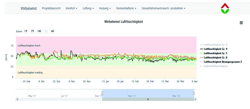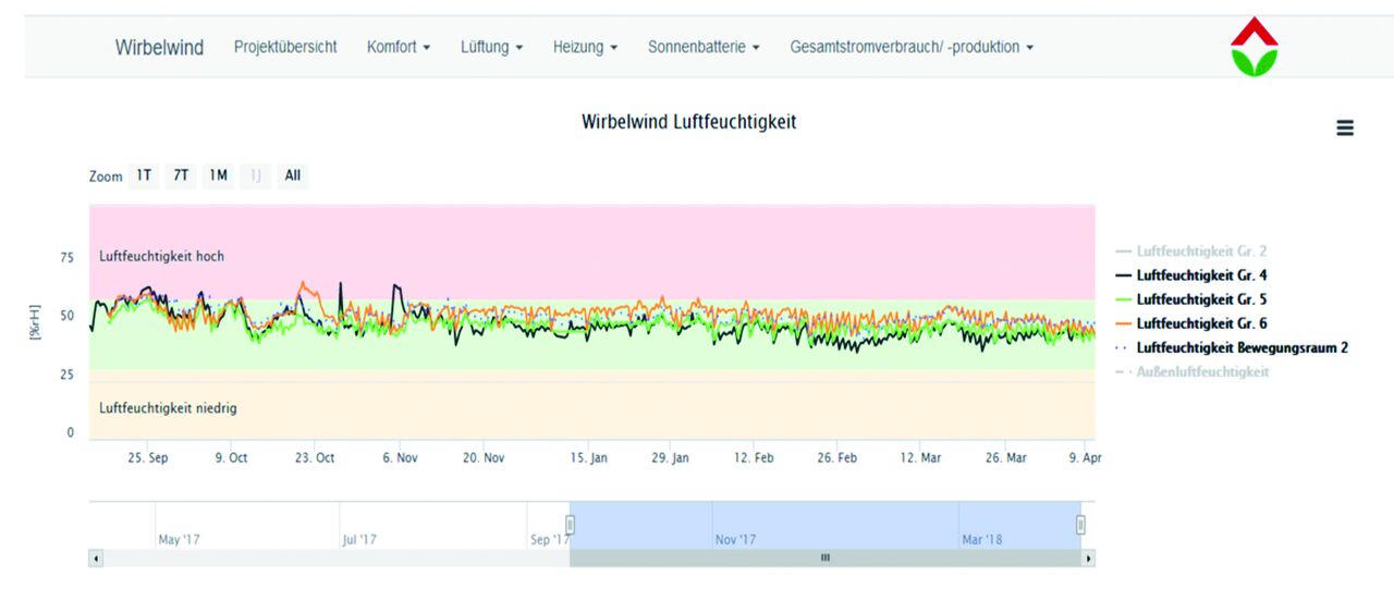 Nach der Einregulierungsphase liegt die Luftfeuchtigkeit nunmehr durchwegs im erwünschten Bereich, ersichtlich in der Visualisierung am grünen Bereich (Abb. 7)