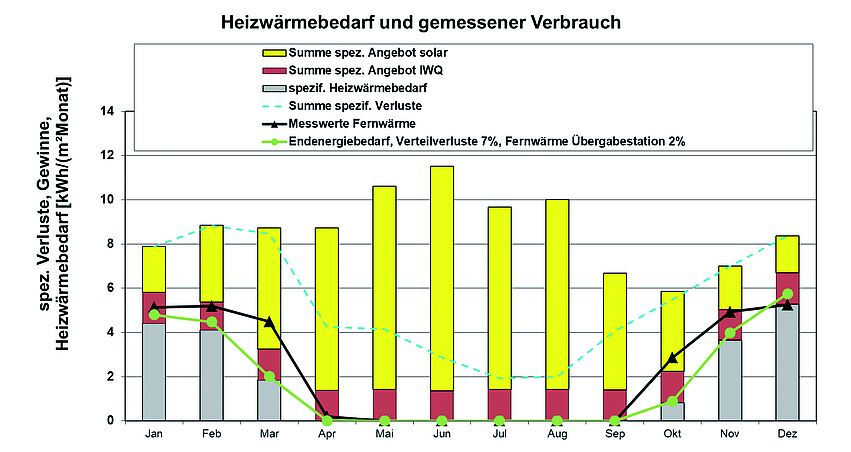 Für den Abgleich der gemessenen und prognostizieren Werte wurde das Monatsbilanzverfahren aus PHPP adaptiert und der berechnete und gemessene Endenergieverbrauch einander gegenübergestellt. Wie man aus der Grafik erkennen kann, liegen Verbrauch und Prognose, erkennbar an der grünen und der schwarzen Linie, in den kalten Monaten knapp aneinander, während in der Übergangszeit v.a. März und Oktober die Differenz zwischen Theorie und Praxis größer ist. Dies liegt vor allem daran, dass die solaren Erträge in den südlich gelegenen Gruppenräumen zwar nutzbar sind, allerdings nicht in den langgestreckten nördlichen Bereich des Gebäudes ankommen. Vor allem an Tagen mit hoher Sonneneinstrahlung werden gerne die Türen zum Spielplatz geöffnet, so entstehen Lüftungsverluste, die im Berechnungsprogramm nicht vorgesehen waren. In Summe beträgt die Abweichung für das ganze Jahr rund 6 kWh. Das Passivhausinstitut führt auch bei sorgfältiger Berechnung eine Abweichung von +/-3 kWh und nochmal denselben Wert für die Messtechnik an. So zeigt sich eine beispielhafte Übereinstimmung von Prognose und tatsächlichem Verbrauch, gelungen durch das Monitoring, das ein rasches Reagieren auf Abweichungen ermöglicht hat (Abb. 1).