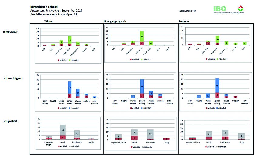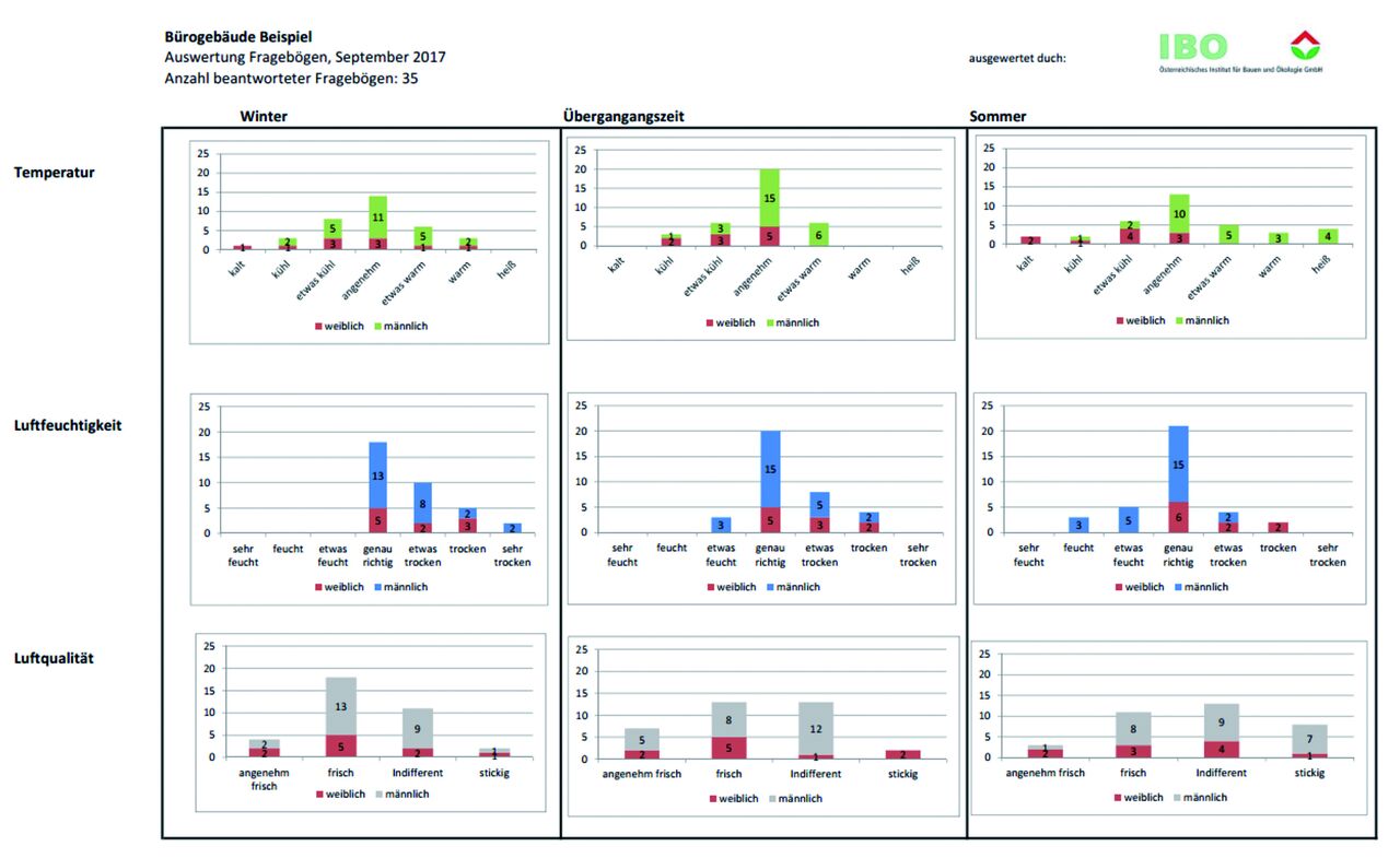 Insofern bieten Messungen der CO2-Konzentration, Luftfeuchtigkeit und TVOC (flüchtige Kohlenwasserstoffe) gute Anhaltspunkte zur Raumluftqualität, auch wenn die subjektiv empfundene davon stark abweichen kann. Fragebögen stellen eine Möglichkeit dar, die Zufriedenheit der Nutzer zu eruieren und die Messergebnisse dem tatsächlich empfundenen Komfort gegenüberzustellen (Abb. 9).