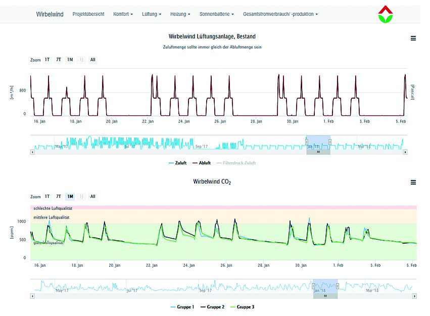 Einige Hersteller bieten bereits vorgefertigte Schnittstellen für ihre Lüftungsanlagen an, womit man diese komfortabel per Weboberfläche konfigurieren kann. Damit können vordefinierte Laufzeiten, Luftmengen sowie die Zulufttemperatur eingestellt werden. Genauso wird bei Fehlfunktionen der Anlage Alarm ausgelöst, wenn z.B. erhöhter Druckabfall auf verschmutze Luftfilter und damit erhöhtem Energieverbrauch hinweist (Abb. 4).