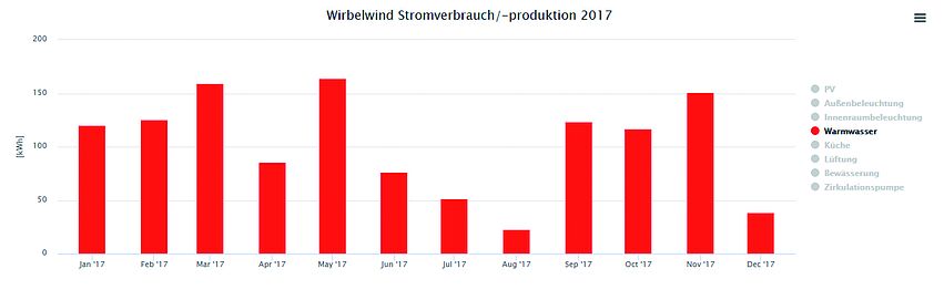 Für die Warmwasserbereitung wird erfreulich wenig Energie verbraucht. Nur rund 1236 kWh wurden im Jahr 2017 verbraucht . Hochgerechnet auf die Belegung entspricht dies in etwa 1,4 Liter pro Person und Tag (ganzes Kalenderjahr und rund 40°C Warmwassertemperatur). Dieser geringe Aufwand wird mit Durchlauferhitzern direkt bei den Wasserentnahmestellen erreicht. Schon in der Planung hat das IBO diese Lösung forciert, denn der Nachteil einer relativ hohen Anschlussleistung (rund 5 kW pro Gerät) wird durch den geringen Energieverbrauch und den Wegfall von Zirkulationsverlusten mehr als kompensiert. Ein weiterer Vorteil dieser Lösung ist, dass durch die niedrige Bereitstellungstemperatur (Verbrühungsschutz) kaum Kalk ausfällt, was auch die Wartungskosten minimiert (Abb. 3).