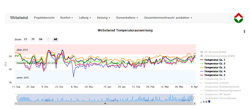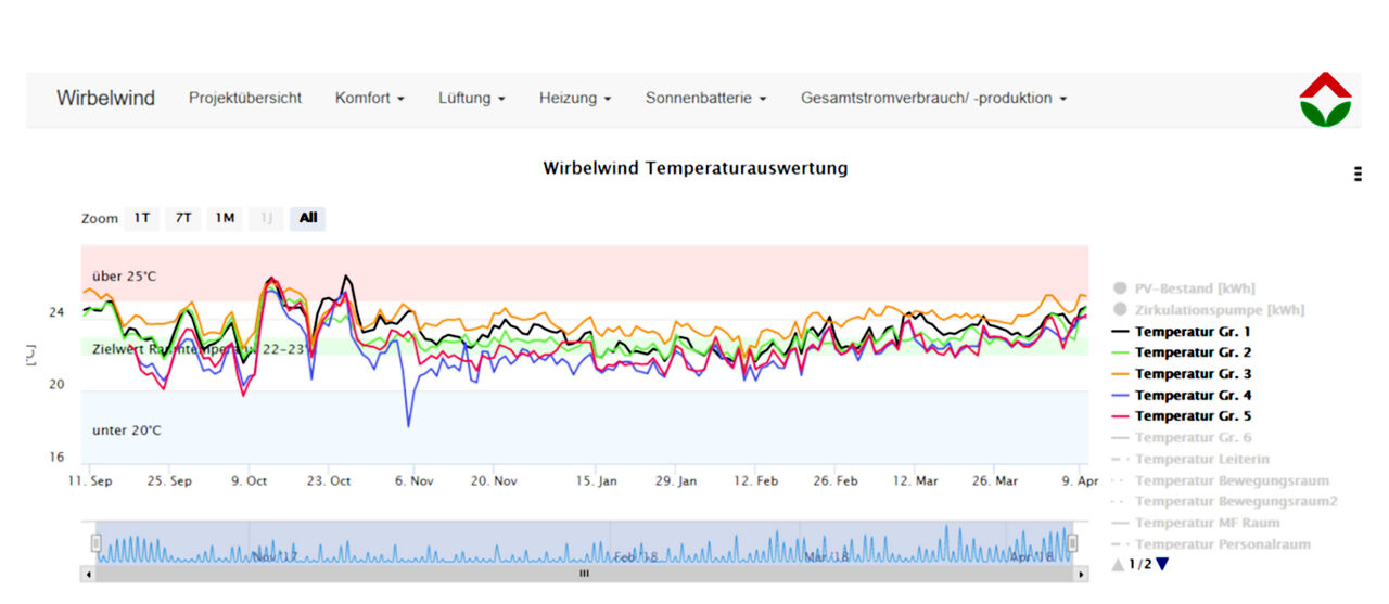 Mit dem Monitoring konnten Raumtemperaturen auf den Soll-Bereich eingependelt werden, wie in der Abbildung 5 erkennbar. Im Rahmen der Erweiterung des Kindergartens im Sommer 2017 musste die Steuerung der Fußbodenheizung neu justiert werden.