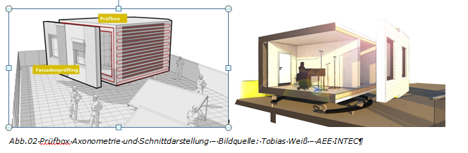 Die Berechnung der Auswirkungen solcher Fassadenmodule auf andere Bauteile, den Innenraum und die Behaglichkeit bringt herkömmliche, rechnergestützte Simulationsmodelle allerdings an ihre Grenzen. Um dennoch fundierte Forschungsergebnisse zu erhalten und die Praxistauglichkeit neuer Baukonstruktionen, Bauteile, Baustoffe und Anlagenkomponenten zu überprüfen, entwickelte das Institut für Nachhaltige Technologien (AEE INTEC) in Zusammenarbeit mit dem Österreichische Institut für Baubiologie und -ökologie (IBO) einen flexiblen und real bewitterten Prüfstand im Maßstab 1:1.