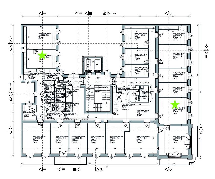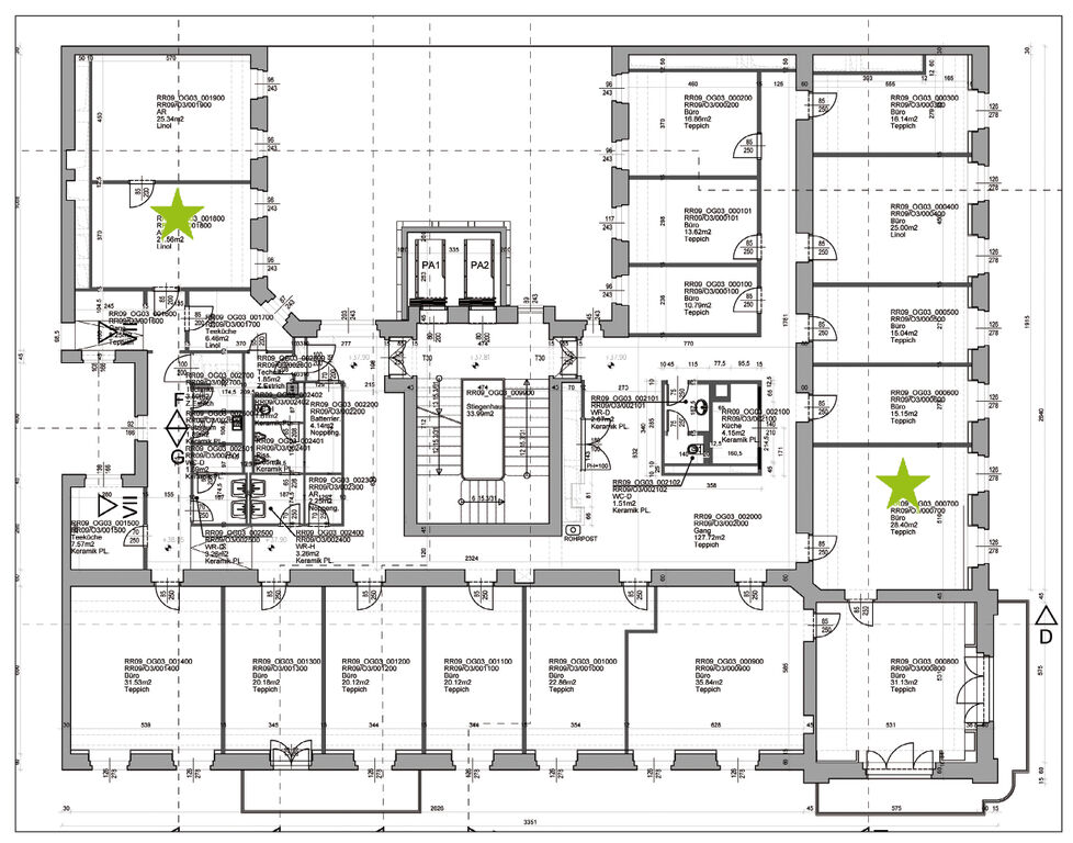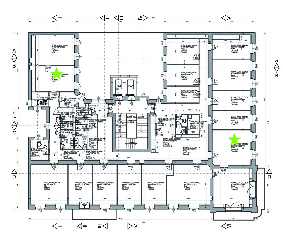 Bei der Auswahl des Innendämmsystems stand neben ökologischen Aspekten hinsichtlich der Materialwahl und der Steigerung von Energieeffizienz und thermischem Komfort die Gebrauchs-tauglichkeit im Fokus. D.h. die dauerhaft schadensfreie Funktionstüchtigkeit der Innendämmung selbst, aber auch einbindender Holzbauteile muss gewährleistet werden. Die Bemessung der Dämmdicke erfolgte dann in Hinblick auf die in Bauordnung und Zertifizierung definierten bauteil- und gebäudebezogenen Zielvorgaben. Da bereits im Bestand eine Vorsatzschale zur Führung von Installationen vorlag, wurde dieses – für Büronutzung typische und praktische – Konzept beibehalten.