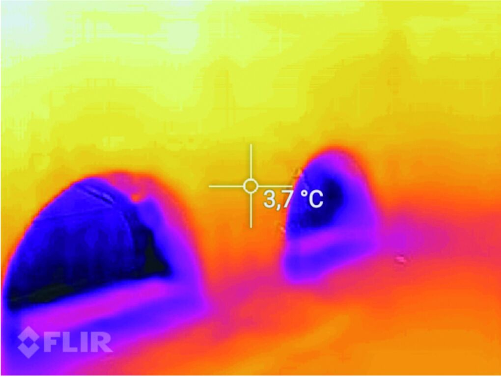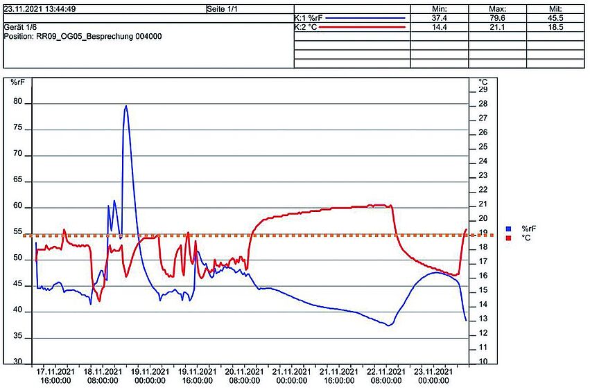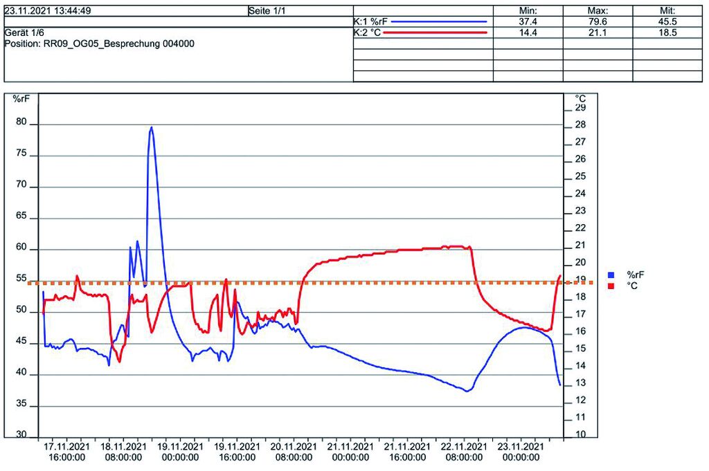 Da die Einbringung neuer Estriche bzw. feuchteintensiver Maßnahmen im gegenständlichen Projekt nur punktuell erfolgte, konnte das baubegleitende Feuchte-Monitoring mit einer Hand voll Datenloggern sehr schlank gehalten werden. Im Zuge der Bauablaufplanung wurden ggf. kritische Räume bzw. Raumverbände identifiziert und mit Datenloggern zur Messung von Raumluftfeuchte und Raumlufttemperatur ausgerüstet (Abbildung 9). Zur Beurteilung wurden, je nachdem wo der Datenlogger appliziert wurde (Raummitte oder Bauteiloberfläche), Grenzwerte definiert, ab denen Maßnahmen (Heizen, Lüften oder Entfeuchten) zur Reduktion der Feuchtelasten im Raum zu ergreifen waren. Als Grenzwert für die Raumluftfeuchte wurden 55 % rel. Feuchte, als Grenzwert für die Bauteiloberflächen max. 70 % rel. Feuchte definiert. Abbildung 10 zeigt eine kritische Feuchtespitze die durch Anhebung der Raumlufttemperatur wieder abgesenkt wurde.