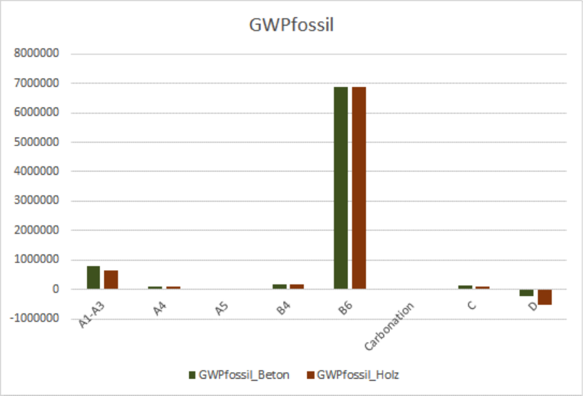 Abgesehen vom dominanten Einfluss der Energieversorgung fällt das meiste GWP bei der Herstellung der Baumaterialien an. Kaum relevant ist der Ein- bzw. Aufbau und vollkommen vernachlässigbar ist der Einfluss der Karbonatisierung von CO2 durch den Beton (weder im Betonbau noch im Massivholzbau) während der hundert jährigen Nutzungsdauer.