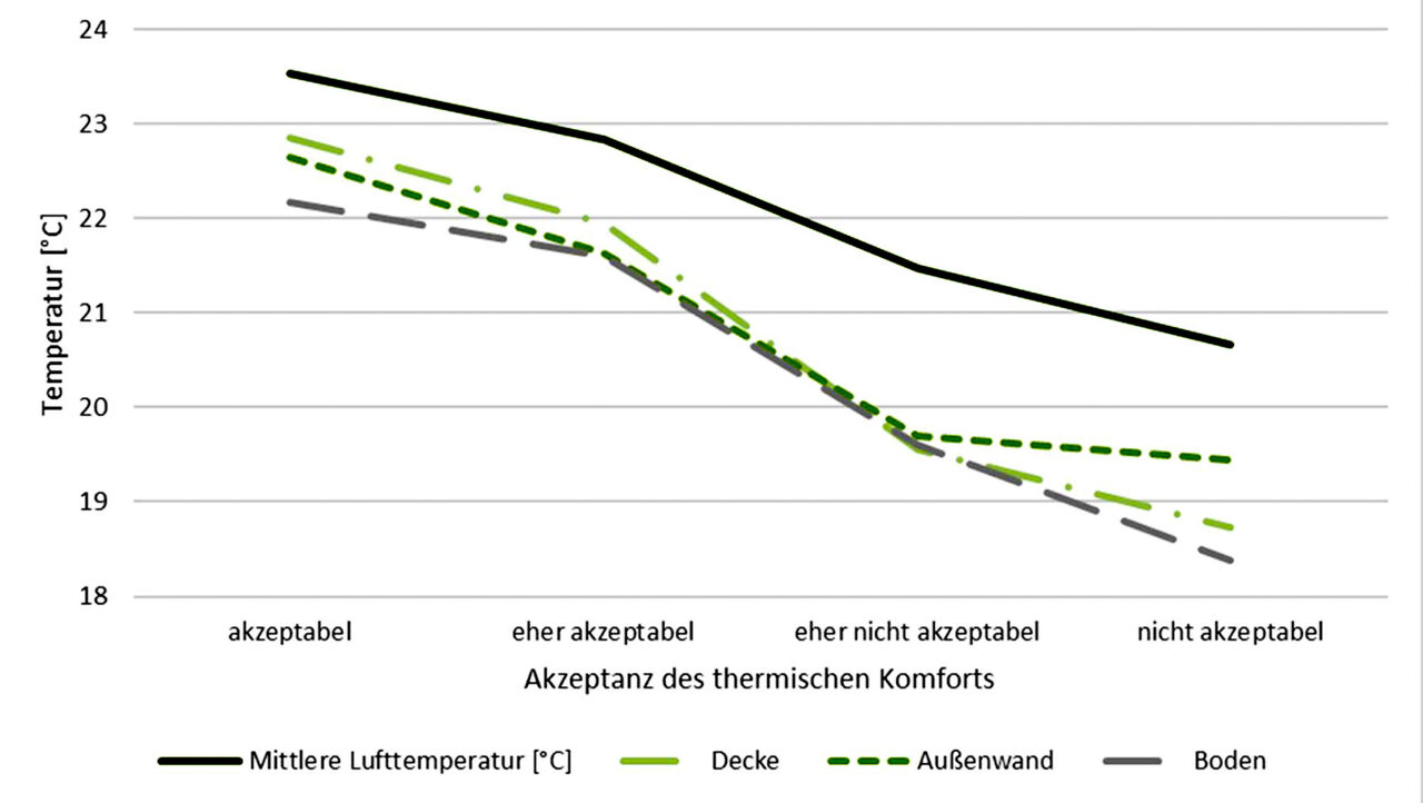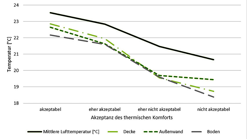 Die Versuchspersonen empfinden Temperaturen unter 20,5 °C Lufttemperatur als inakzeptabel. Auf diese Grenze muss also bei Energiesparmaßnahmen besonders geachtet werden, da Grenzunterschreitungen in diese Richtung zu großem Unmut führen würden.