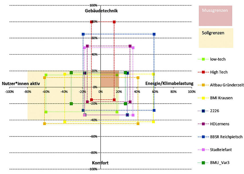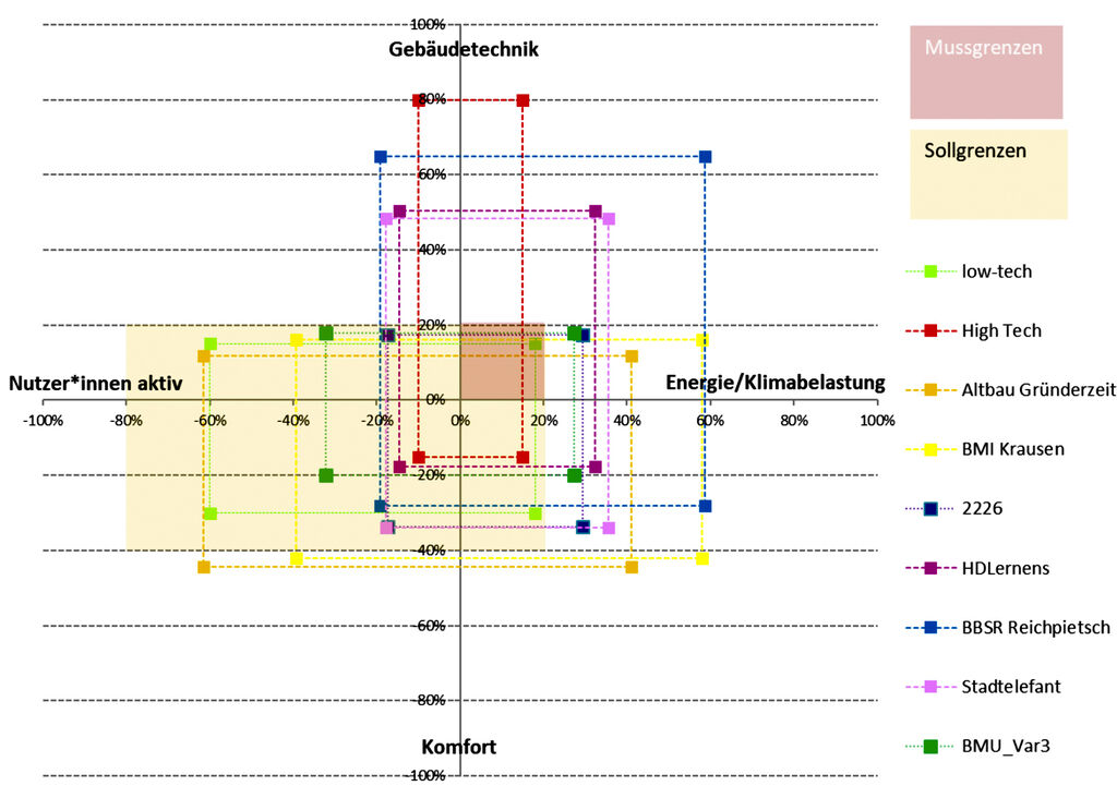 Die Anforderung Gebäudetechnik wird von den Gründerzeitgebäuden, dem Gebäuden 2226 und BMU_Var3 unterschritten.