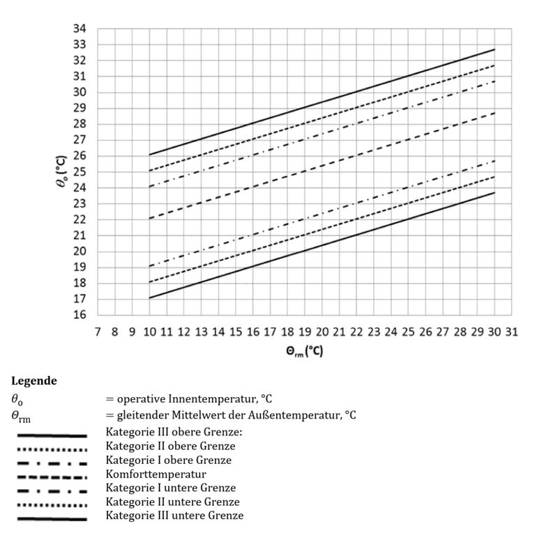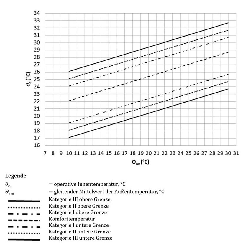 - Außentemperatur: Der gleitende Mittelwert der Außentemperatur bestimmt die Grenzen der Behaglichkeitsklassen im adaptiven Modell.