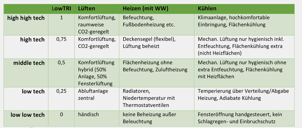 Für die Entwicklung des LowTRI wurden Muss- und Sollkriterien sowohl für den Aufwand für die Gebäudetechnik (Herstellung, Wartung, Instandsetzung) und die Bautechnik, die Kompatibilität mit der Klimaneutralität 2040, als auch den Nutzer:innenkomfort festgelegt. Diese wurden gewichtet und ermöglichen, die Aufwände und Qualitäten einer spezifischen Gebäudeausstattung einander gegenüberzustellen.
