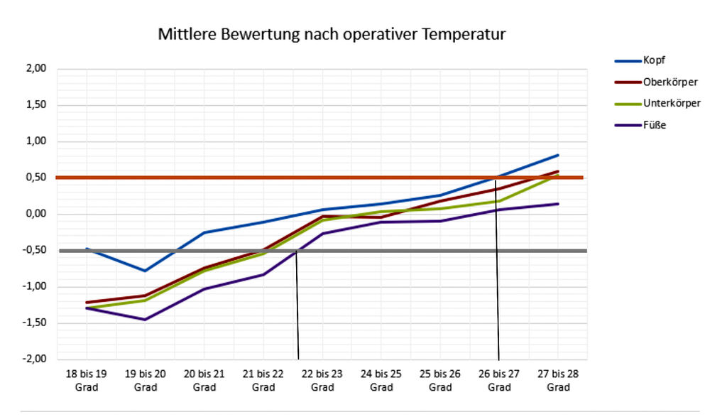 Grundsätzlich stimmen die Bewertungen mit den bekannten Temperaturverläufen überein (Abb. 2, Abb. 3). Es ist zu erkennen, dass die Füße die höchste mittlere Raumtemperatur benötigen bis sie in die Komfortzone (PMV = - 0,5) kommen und der Kopf den Komfortbereich schon bei 26,5 °C wieder verlässt. Besonders interessant sind die Votings bezüglich Behaglichkeit. Hier zeigen die Versuche, dass sich die Personen, entgegen dem gängigen Modell, deutlich toleranter gegenüber höheren Temperaturen verhalten (Abbildung 3, Variablen ThKomfort).