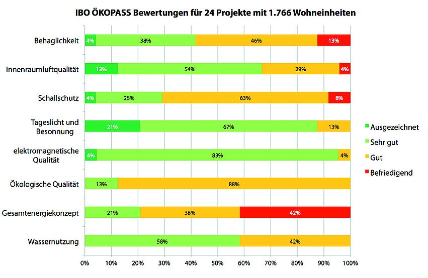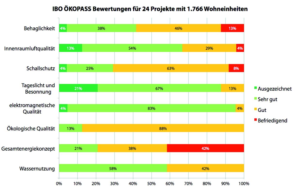 Schallschutz, Innenraumluftqualität und Behaglichkeit sind die Kriteriengruppen, in denen alle 4 Bewertungskategorien vergeben worden sind. Womit ist das zu erklären, wenn doch die Bauweisen recht ähnlich sind? Bei der Bewertung des Schallschutzes und der Innenraumluftqualität werden stichprobenartige Messungen in kritischen Räumen durchgeführt. So fließen auch die Raumgeometrie und die Ausführungsqualität in die Bewertung mit ein und man findet projekt-, ja sogar wohnungs- und raumbezogene Differenzen. Bei den Messungen der Innenraumluftqualität können bereits kleinste Spuren von störenden Substanzen oder Schimmelpilzsporen erfasst werden und entsprechende Maßnahmen getroffen werden (wie z.B. punktuelle Sanierungen, mechanische Trocknung, Vermeidung spezifischer Baumaterialien etc.).