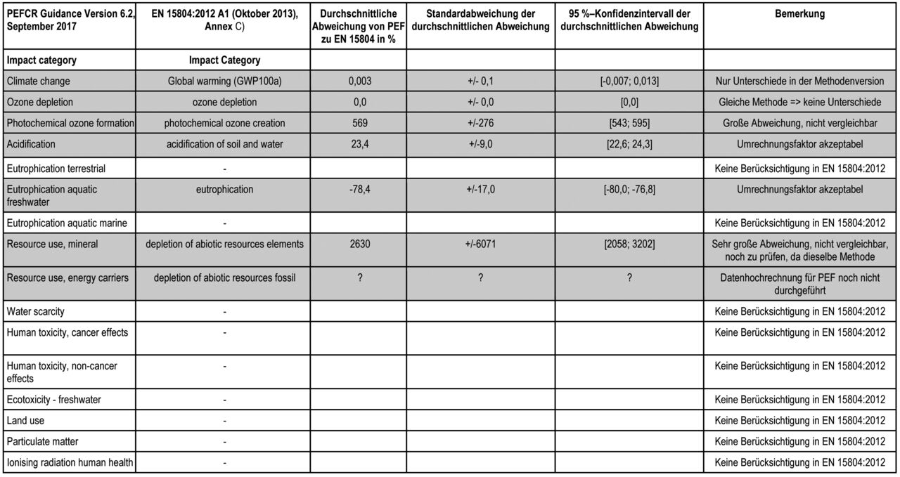 Zum Vergleich wurden nun die IBO-Richtwerte für Baumaterialen (Stand April 2017) auch mit den im PEFR Guidance Version 6.2 vom September 2017 vorgeschlagenen Wirkungsindikatoren berechnet. In Tabelle 2 sehen Sie eine Gegenüberstellung der verwendeten Methoden von EN 15804 und PEF.